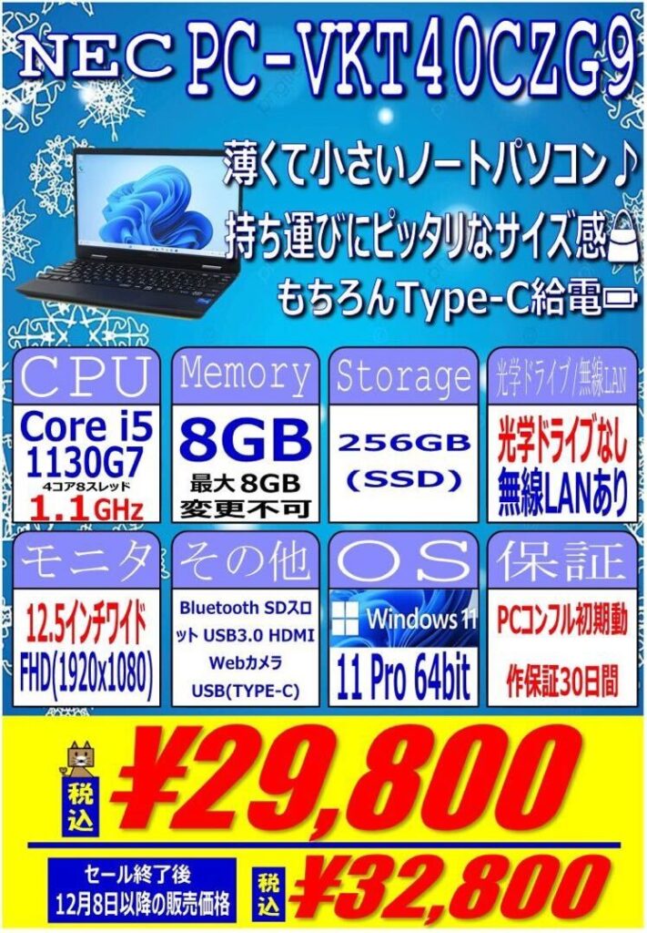 第11世代 Core i5搭載、8GB / 256GB SSD、12.5インチワイドFHD、Windows11 Proという構成で29,800円です。