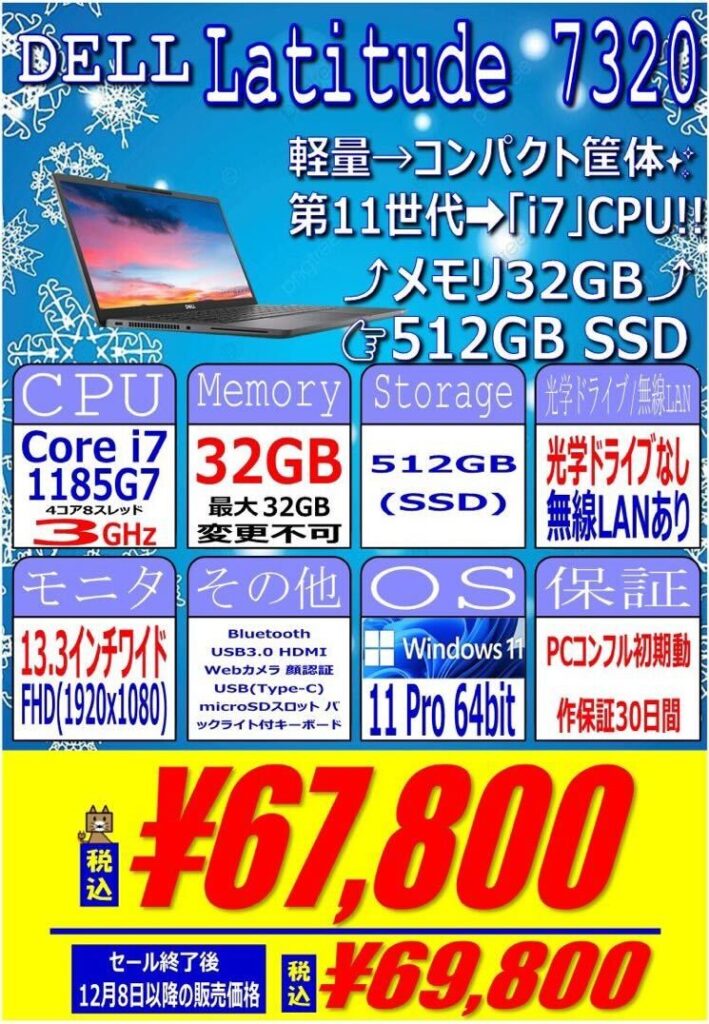第11世代 Core i7搭載、32GB / 512GB SSD、13.3インチワイドFHD、Windows11 Proという構成で67,800円です。