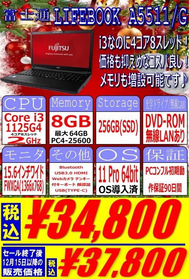 第11世代Core i3搭載、8 GB / 256GB SSD、15.6インチワイドFWXGA、Windows 11 proという構成で34,800円です。