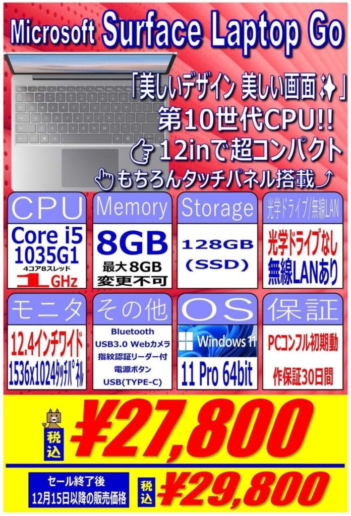 第10世代 Corei5搭載、8GB / 128GB SSD、12.4インチワイドタッチパネル対応、Windows 11 proという構成で27,800円です。