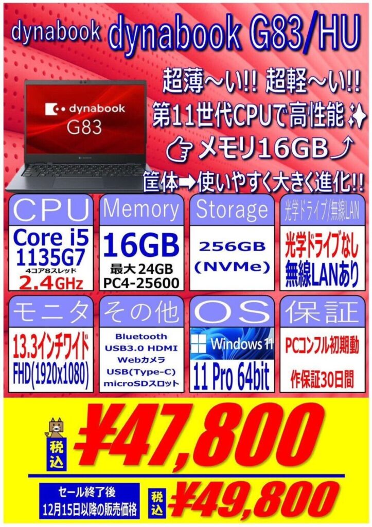 第11世代 Core i5搭載、16GB / 256GB SSD、13.3インチワイドFHD、Windows11 Proという構成で47,800円です。