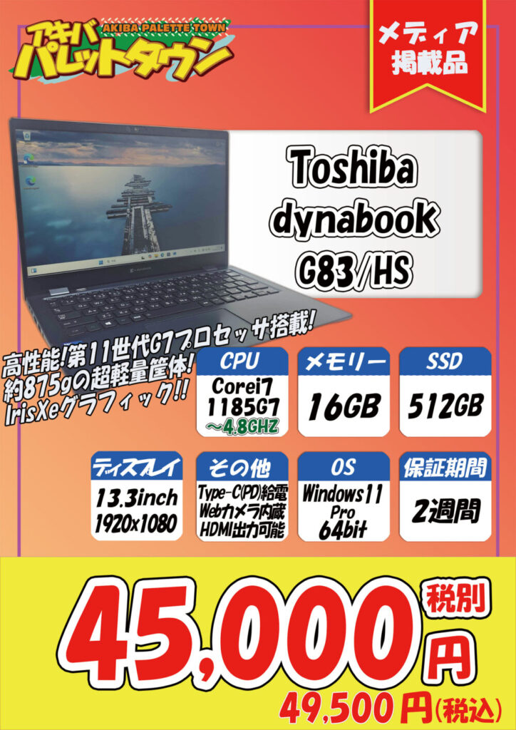 第11世代 Core i7搭載、16/ 512GB SSD、13.3インチ、Windows 11 proという構成で、49,500円です。