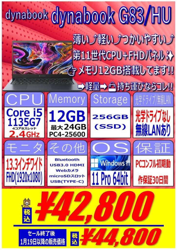 第11世代Core i5搭載、12GB / 256GB SSD、13.3インチワイドFHD、Windows 11 proという構成で42,800円です。