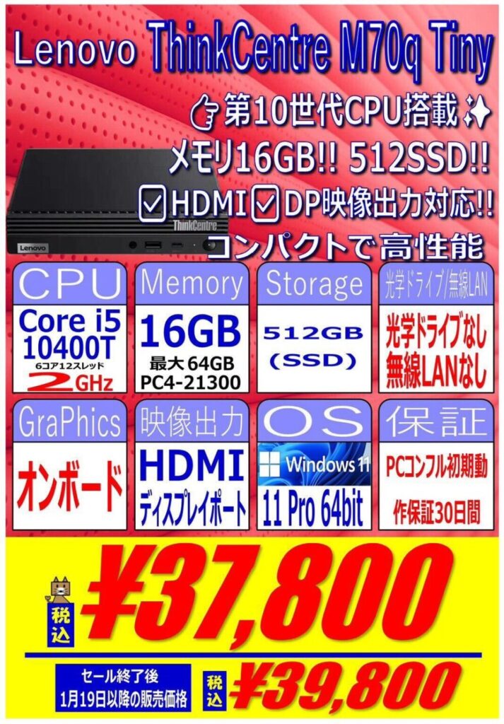 Lenovo「ThinkCentre M70q Tiny」税込37,800円