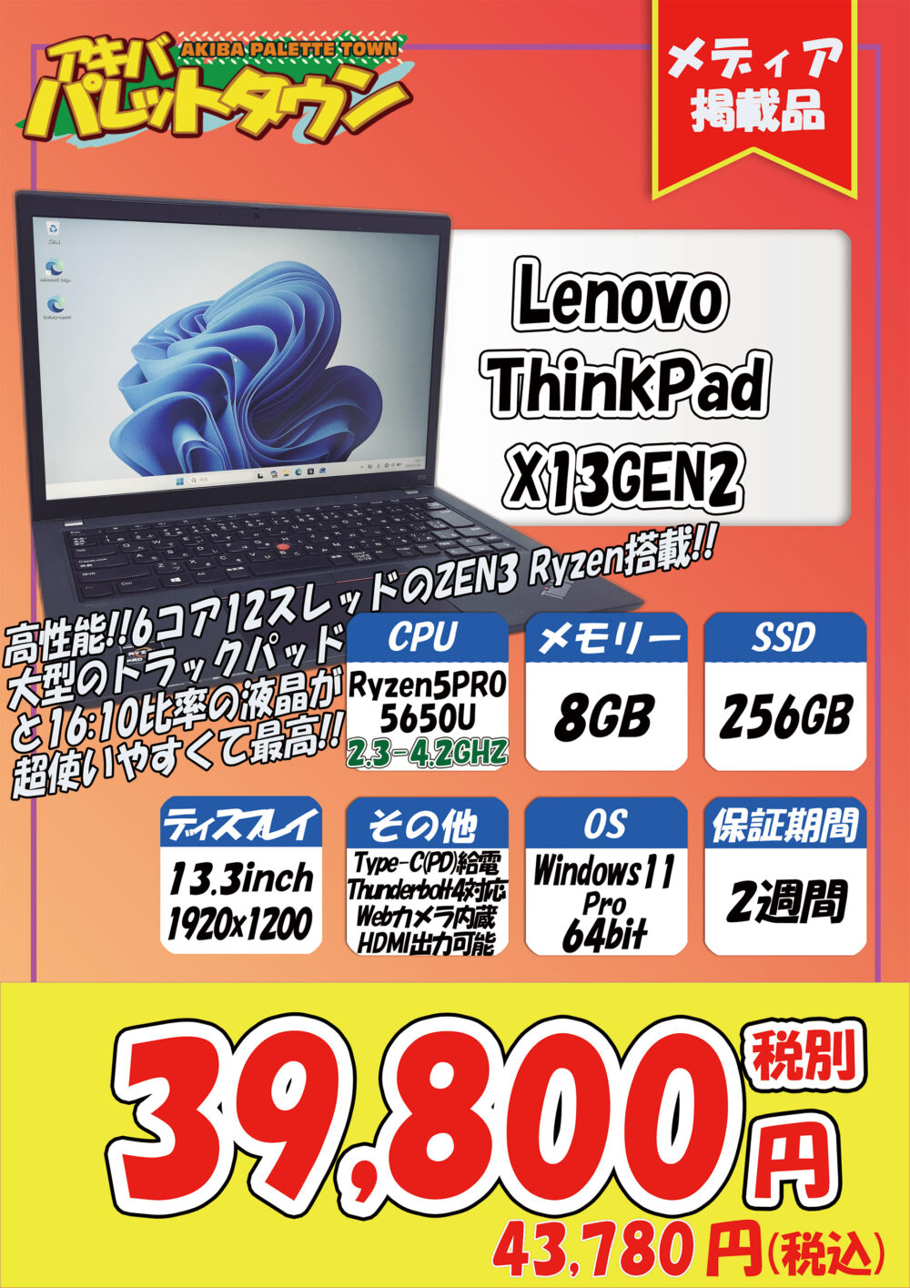 ZEN3 Ryzen搭載、8/ 265GB SSD、13.3インチ、Windows 11 proという構成で、43,780円