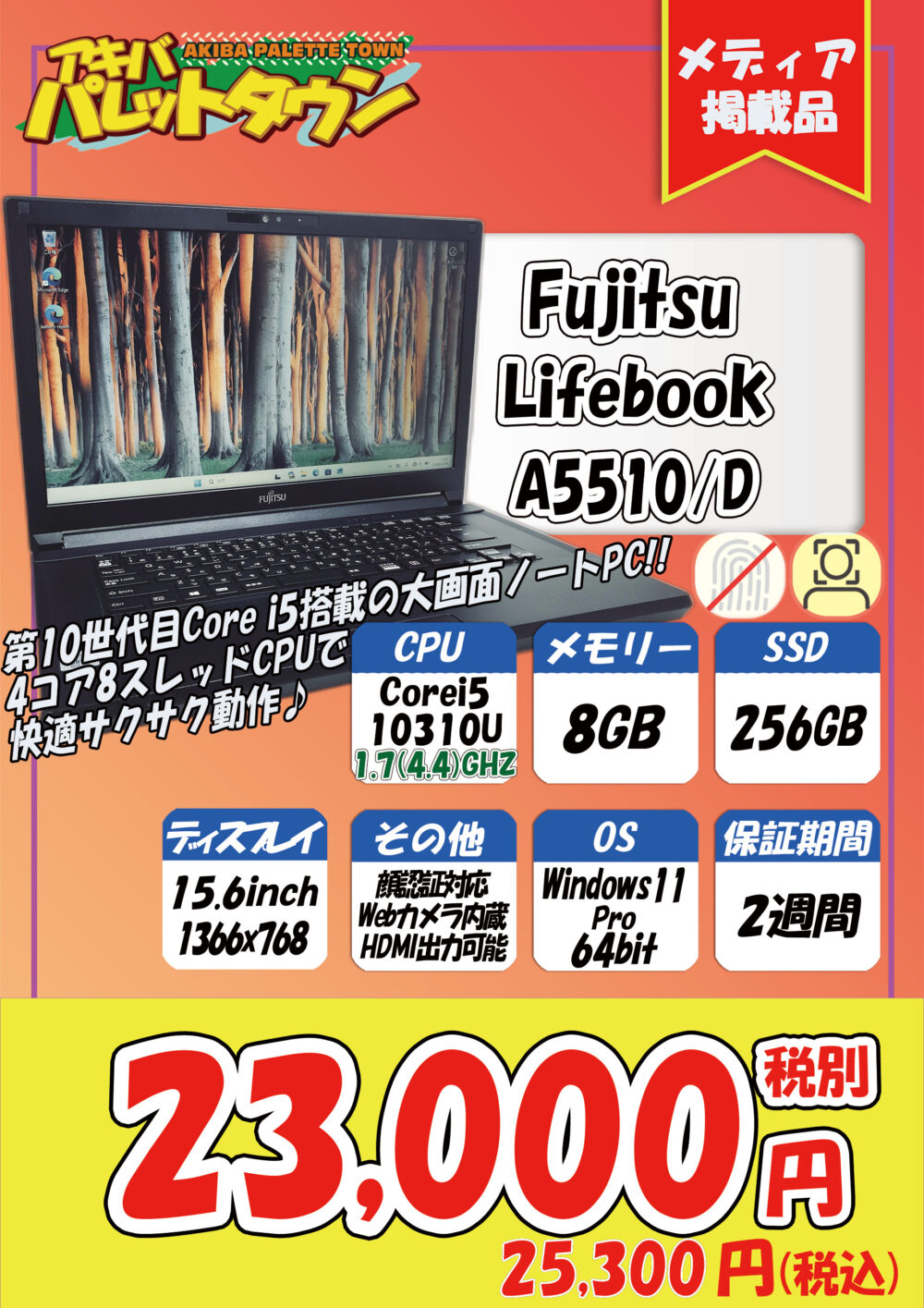 第10世代Core i5搭載、8/256GB SSD、15.6インチ、Windows 11 Proという構成で、25,300円です。