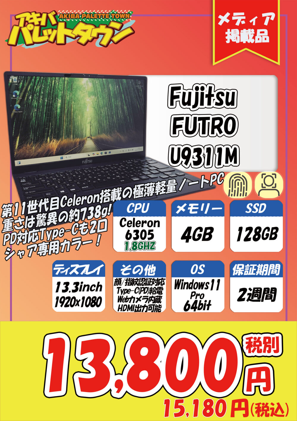 富士通製Celeron搭載、4 / 128 GB SSD、13.3インチ、Windows11 Pro 64bitという構成で、15,180円で、これ以外にも多数の特価品が出ています。