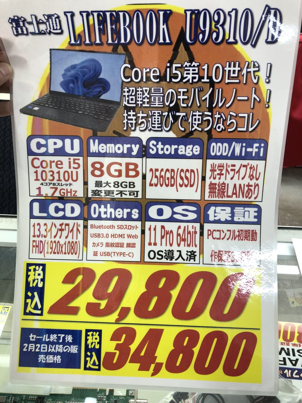 第10世代Core i5搭載、8GB / 256GB SSD、13.3インチワイドFHD、Windows 11 Proという構成で29,800円です。