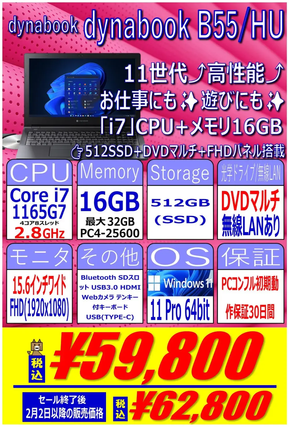 第11世代 Corei7搭載、16GB / 512GB SSD、Windows 11 proという構成で59,800円です。
