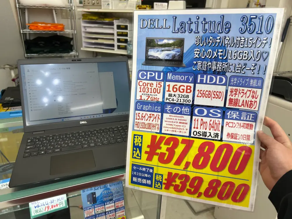第8世代Core i3搭載、 8GB / 256GB SSD、15.6インチワイドFWXGA、Windows11 Proという構成で15,800円です。