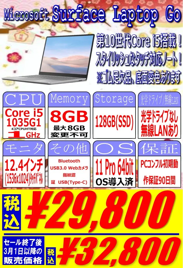 第10世代Core i5搭載、8GB / 128GB SSD、12.4インチタッチパネル、Windows 11 proという構成29,800円です。