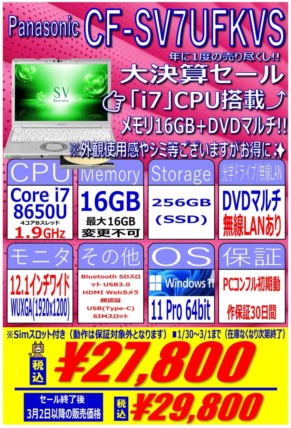 第8世代Core i7搭載、16GB / 256GB SSD、12.1インチワイドWUXGA、Windows 11 proという構成で27,800円です。