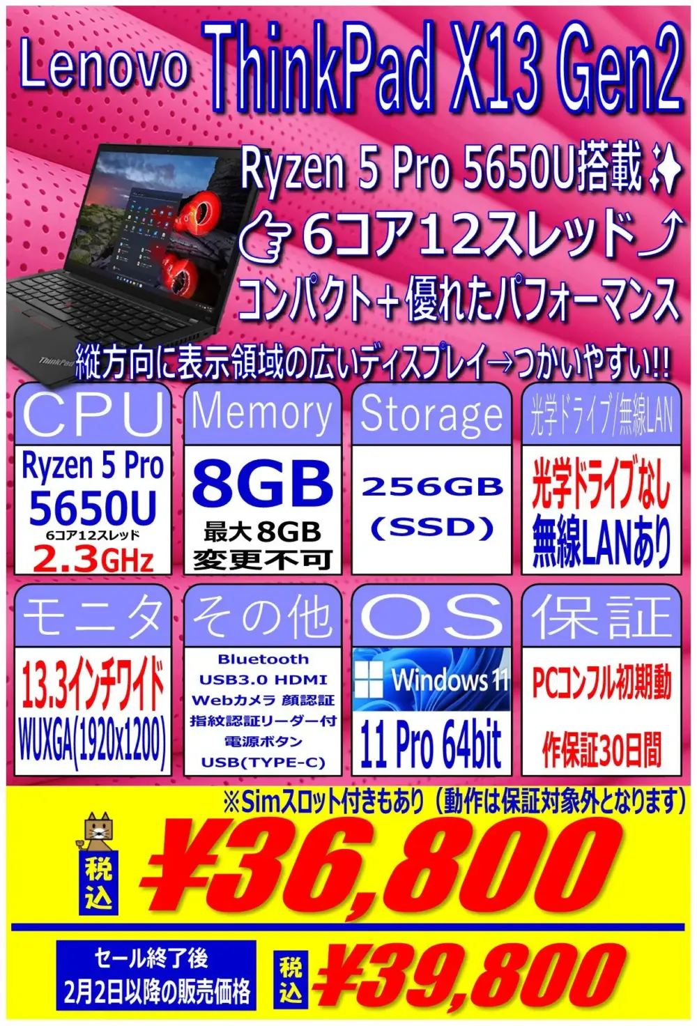 Ryzen 5 Pro 5650U搭載、8GB / 256GB SSD、13.3インチワイドWUXGA、Windows 11 proという構成で36,800円です。
