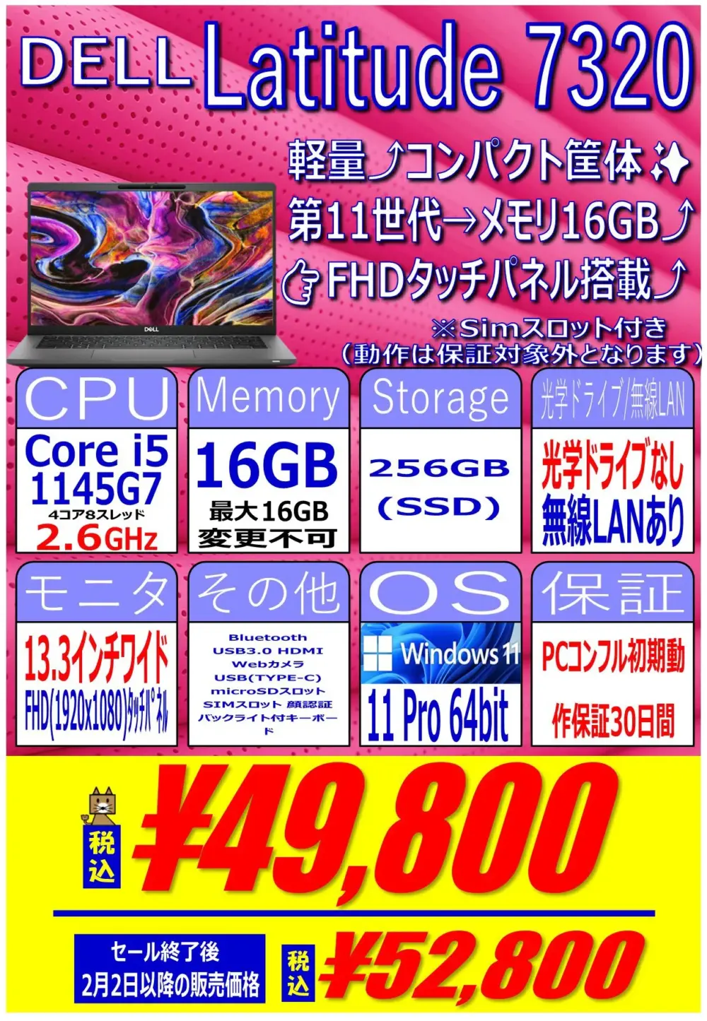 第11世代Core i7搭載、16GB / 256GB SSD、Windows 11 proという構成で49,800円です。