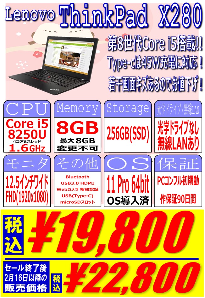 Lenovo「ThinkPad X280」 税込19,800円