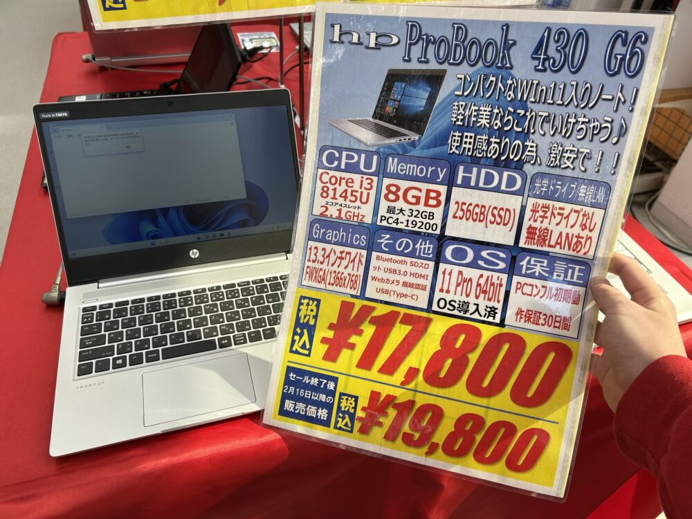 第8世代Core i5搭載、8GB / 128GB SSD、13.3インチワイドFHD、Windows 11 Proという構成で17,800円です。