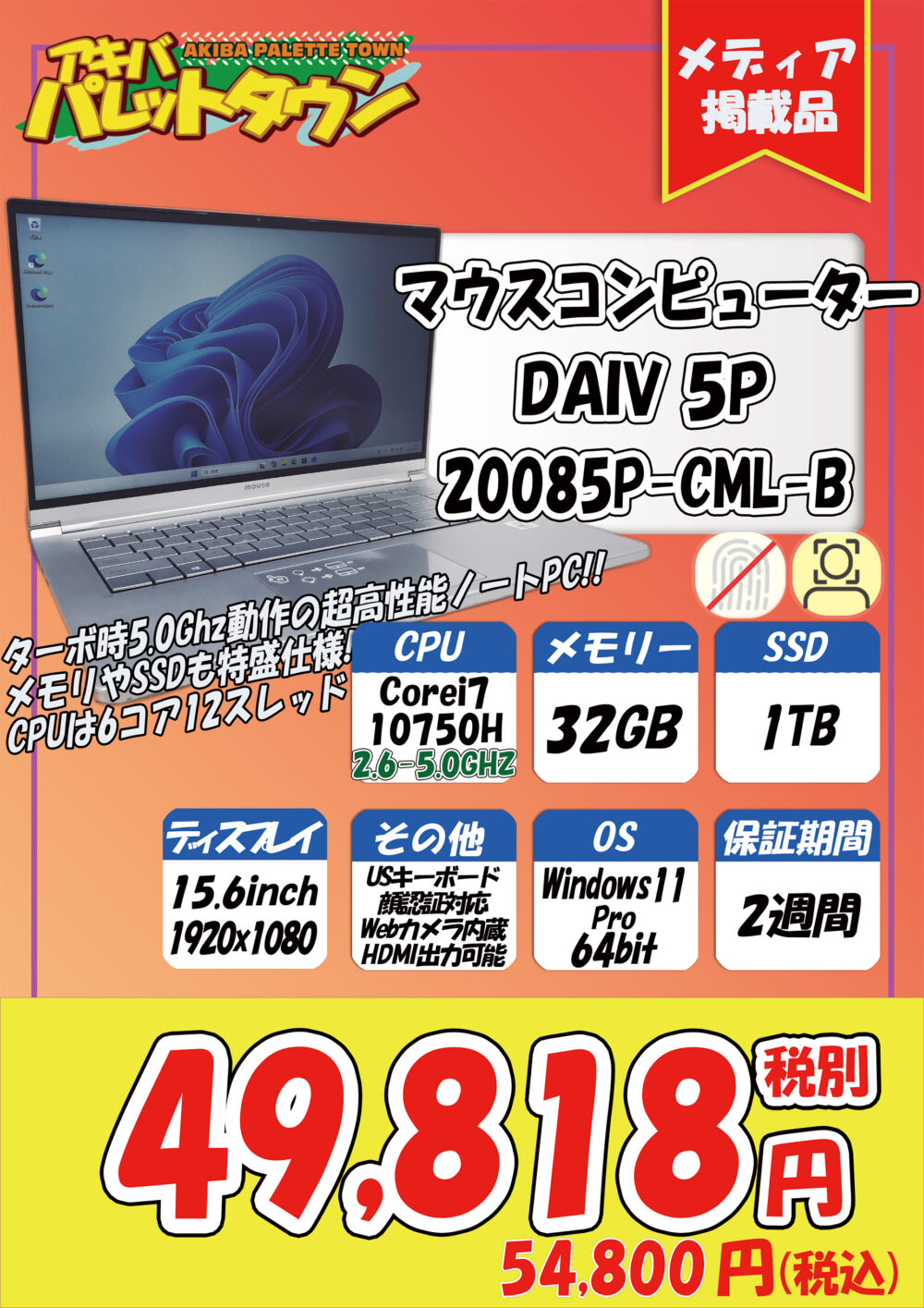 第10世代Core i7搭載、32/ 1TB SSD、13.3インチ、Windows 11 proという構成で、49,818円です。