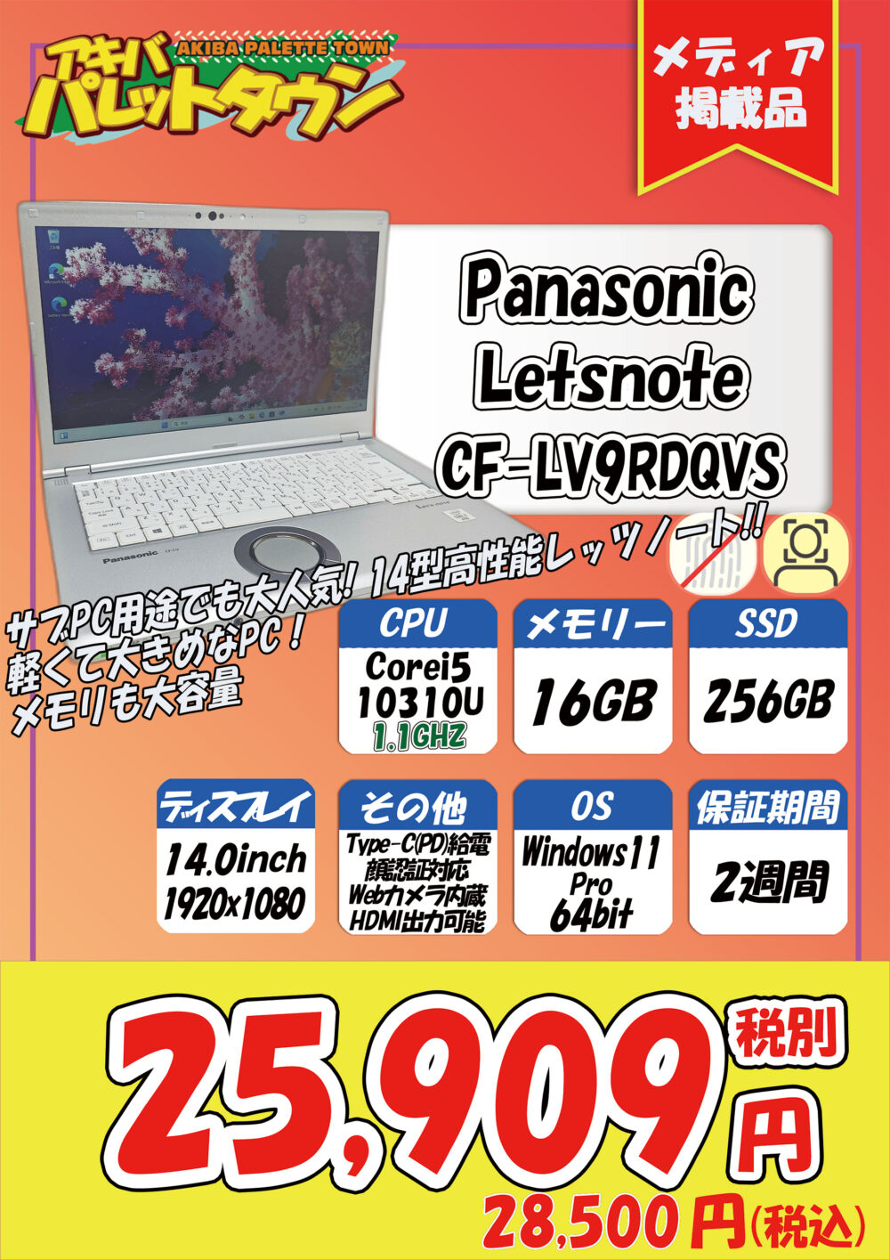第10世代Corei5搭載、16/256 GB SSD、14.0インチ、Windows 11 Proという構成で、25,909円です。