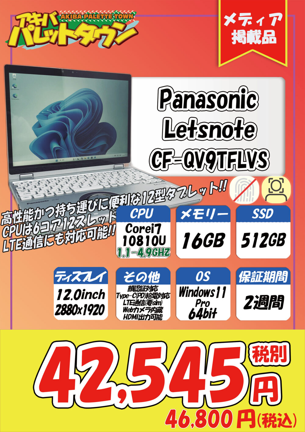 第10世代Core i7搭載、16/ 512GB SSD、12.0インチ、Windows11 proという構成で、42,545円です。