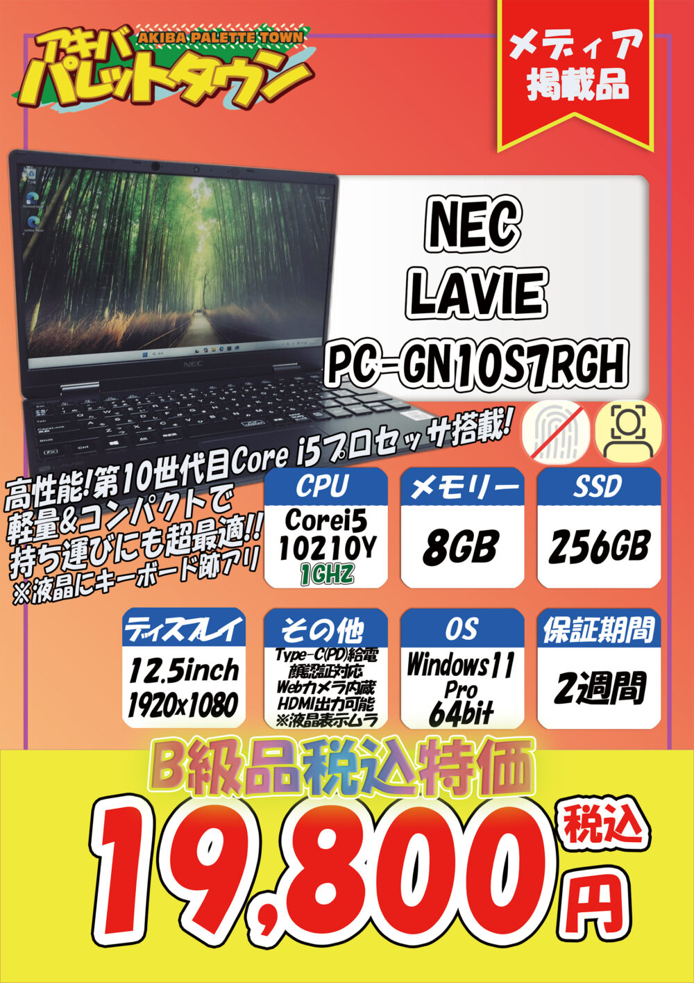 NEC製で、第10世代Corei5搭載、8 / 256 GB SSD、12.5インチ、Windows11 Pro 64bitという構成で、19,800円で、これ以外にも多数の特価品が出ています。