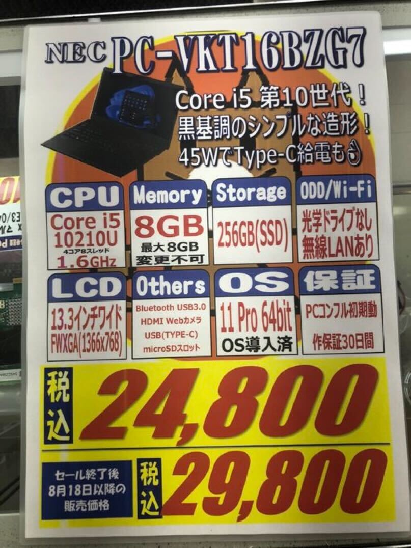 第10世代Core i5搭載、8GB / 128GB SSD、12.5インチワイドFHD、Windows 11 proという構成のNEC製ノートPCが19,800円など、今週もお買い得品多数。