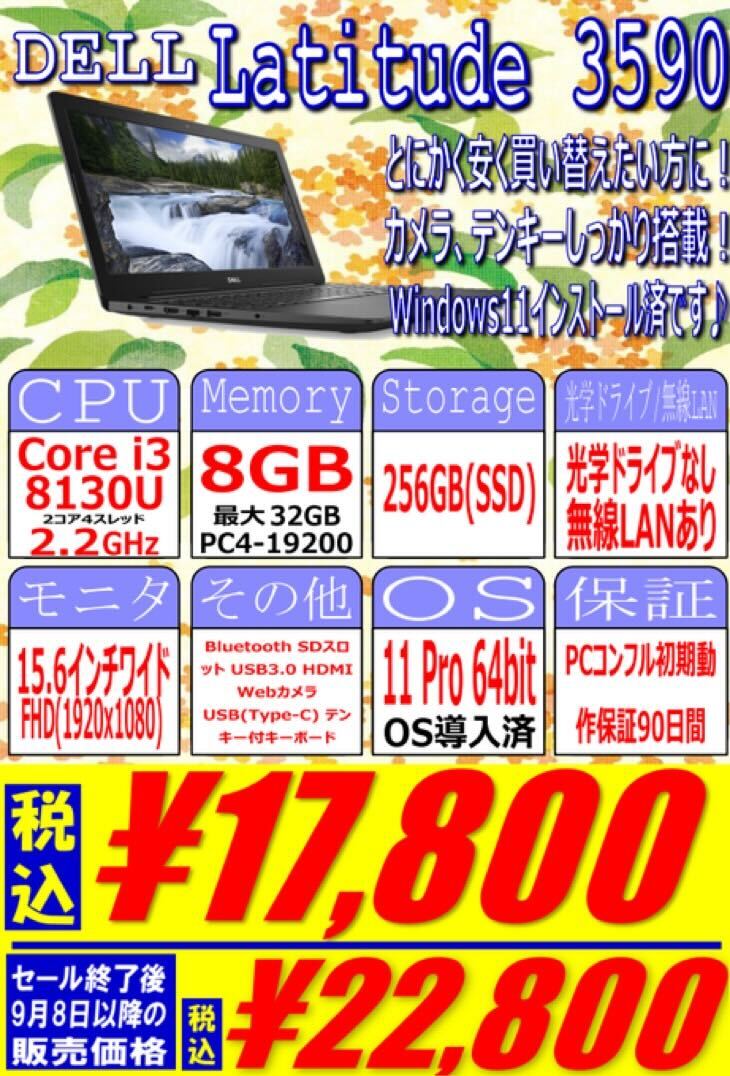 第8世代Core i3搭載、8GB / 256GB SSD、15.6インチワイドFHD、Windows 11 proという構成で17,800円です。