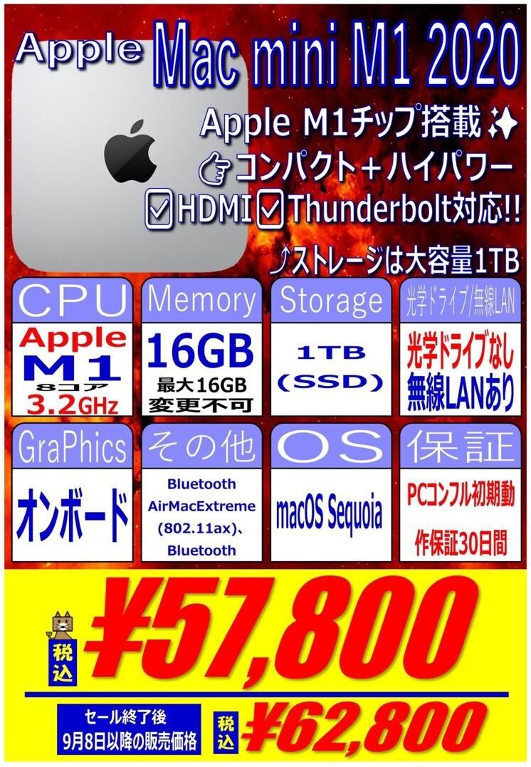 M1搭載、16GB / 1TB SSD、mac OS Sequoiaという構成で57,800円です。
