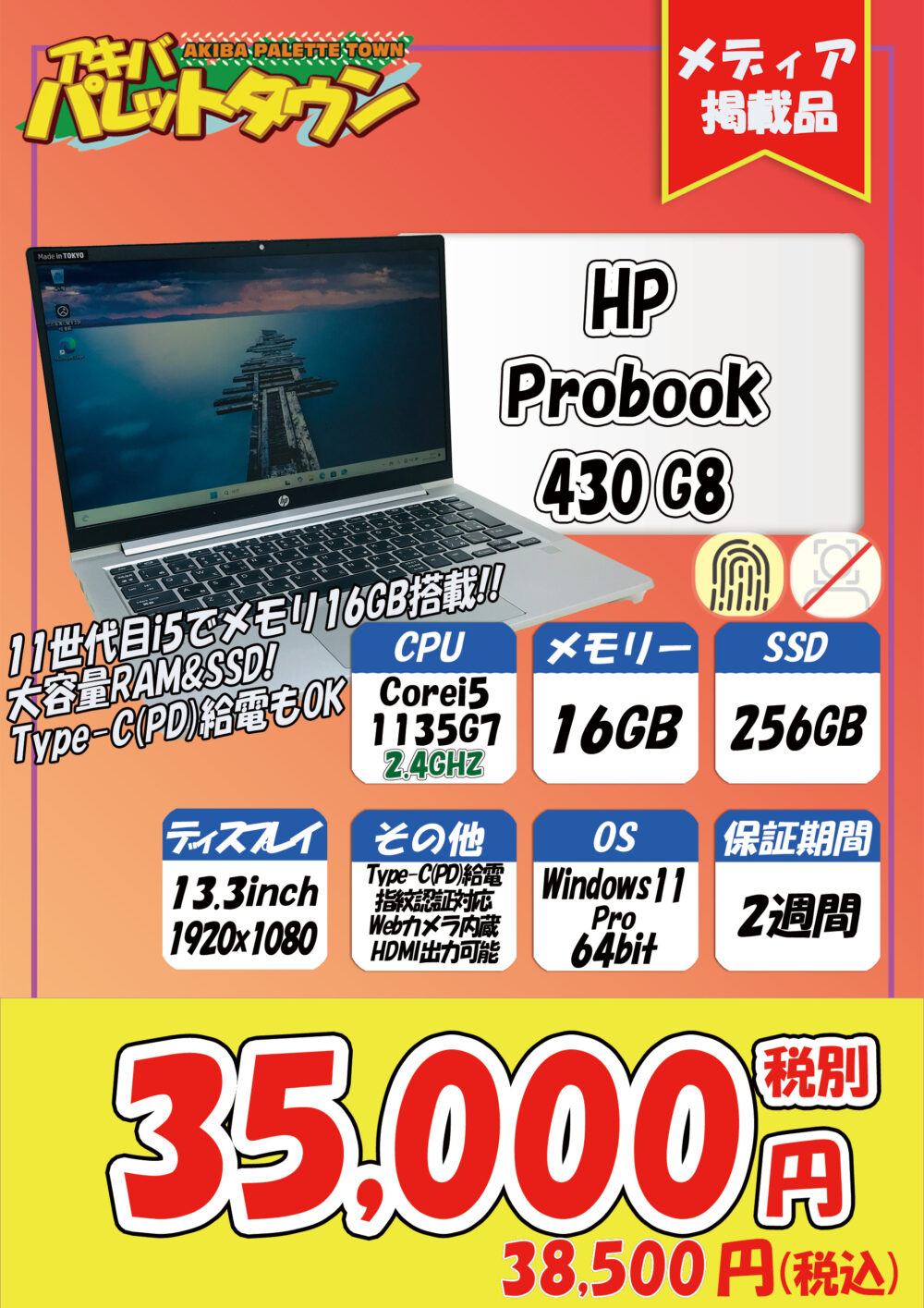 第11世代Core i5搭載、16 / 256GB SSD、13.3インチ、Windows 11 Pro搭載という構成で、38,500円です。