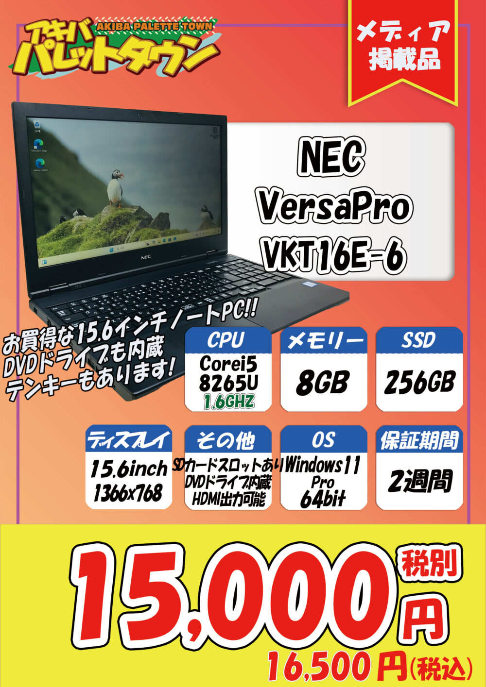 第8世代Core i5搭載、8/256GB SSD、15.6インチ、Windows 11 Proという構成で、16,500円です。