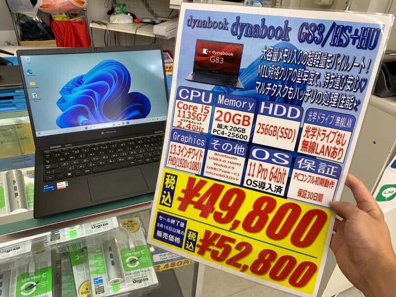 第11世代Core i5搭載、20GB / 256GB SSD、13.3インチワイドFHD、Windows 11 proという構成で49,800円です。