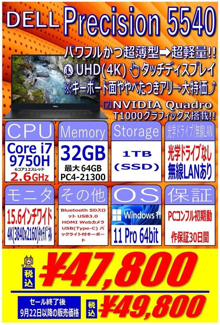 第9世代 Core i7搭載、32GB / 1TB SSD、15.6インチワイド4Kタッチパネル対応、Windows 11 proという構成で47,800円です。