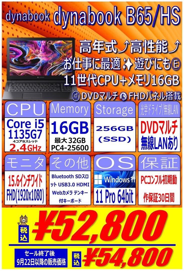 第11世代 Core i5搭載、16GB / 256GB SSD、15.6インチワイドFHD、Windows11 pro という構成で52,800円です。
