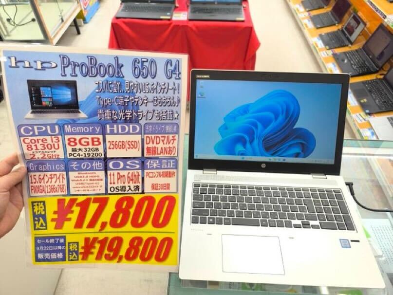 第8世代Core i3搭載、8GB / 256GB SSD、15.6インチワイドFWXGA、Windows 11 proという構成で17,800円です。
