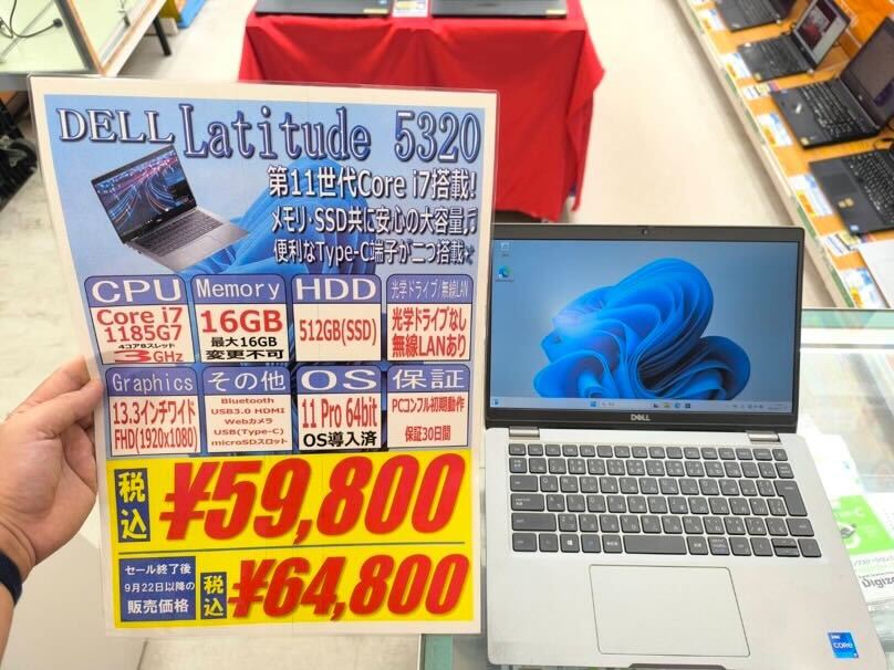 第11世代Core i7搭載、16GB / 512GB SSD、13.3インチワイドFHD、Windows 11 proという構成で59,800円です。