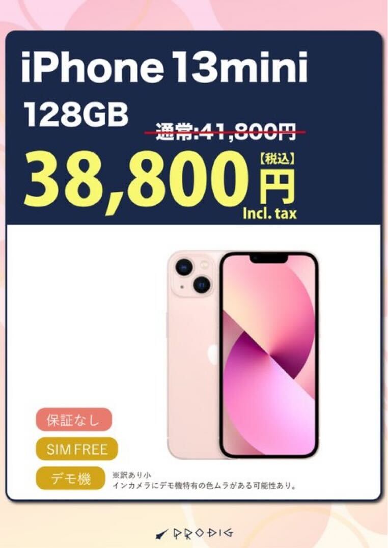 iPhone13 miniが、SIMFREE 128GB デモ機/フロントカメラ焼き付き/キズありで税込38,800円です。