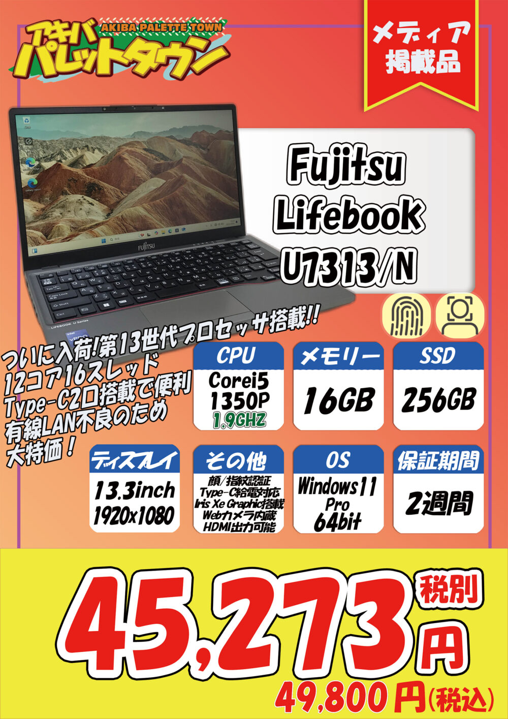 第13世代Core i5搭載、16 / 256GB SSD、13.3インチ、Windows 11 Pro搭載という構成で、49,800円です。