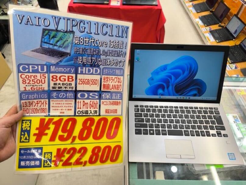 第8世代Core i5搭載、8GB / 256GB SSD、13.3インチワイドFHD、Windows 11 proという構成で19,800円です。