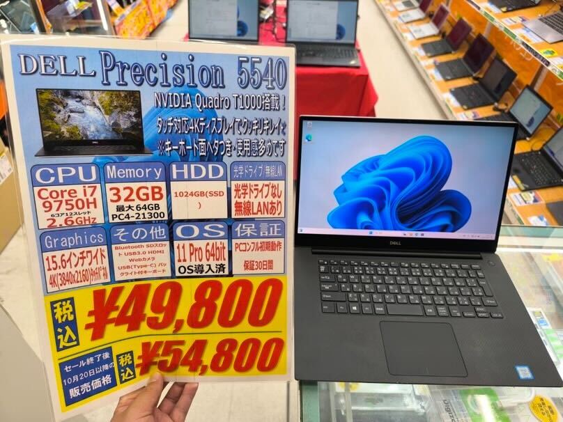 第9世代Core i7搭載、32GB / 1024GB SSD、15.6インチワイド4Kタッチパネル対応、Windows 11 proという構成で49,800円です。