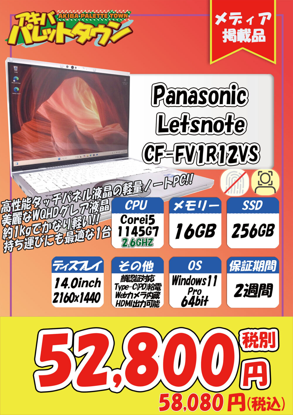 第11世代Core i5搭載、16 / 256GB SSD、14インチ、Windows 11 Pro搭載という構成で、58,080円です。