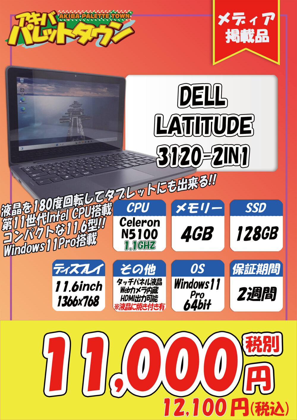 Celeron N5100搭載、4/128GB SSD、11.6インチ、Windows 11 Proという構成で、12,100円です。