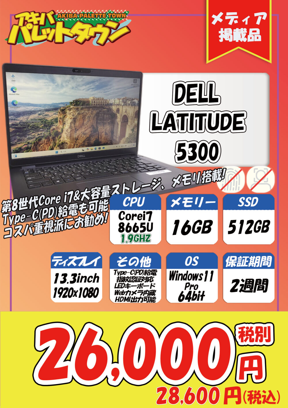 第8世代Core i7搭載、16 / 512GB SSD、13.3インチ、Windows 11 Proという構成で、28,600円です。