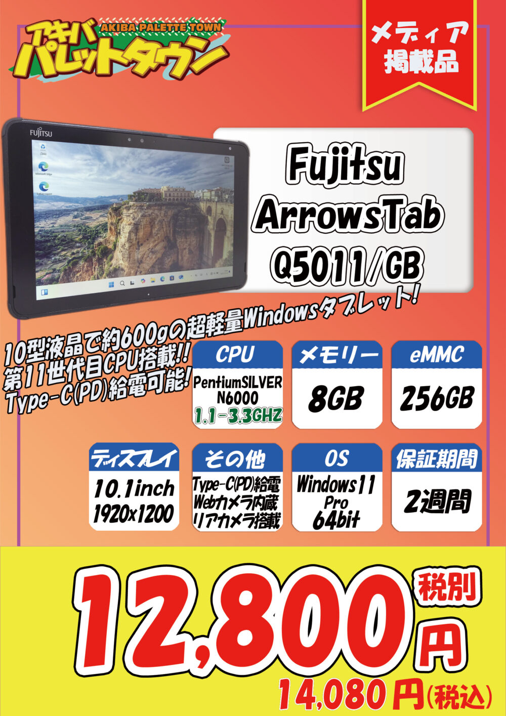 Pentium Silver N6000搭載、8 / 256GB SSD、10.1インチ、Windows11 Proという構成で、14,080円です。