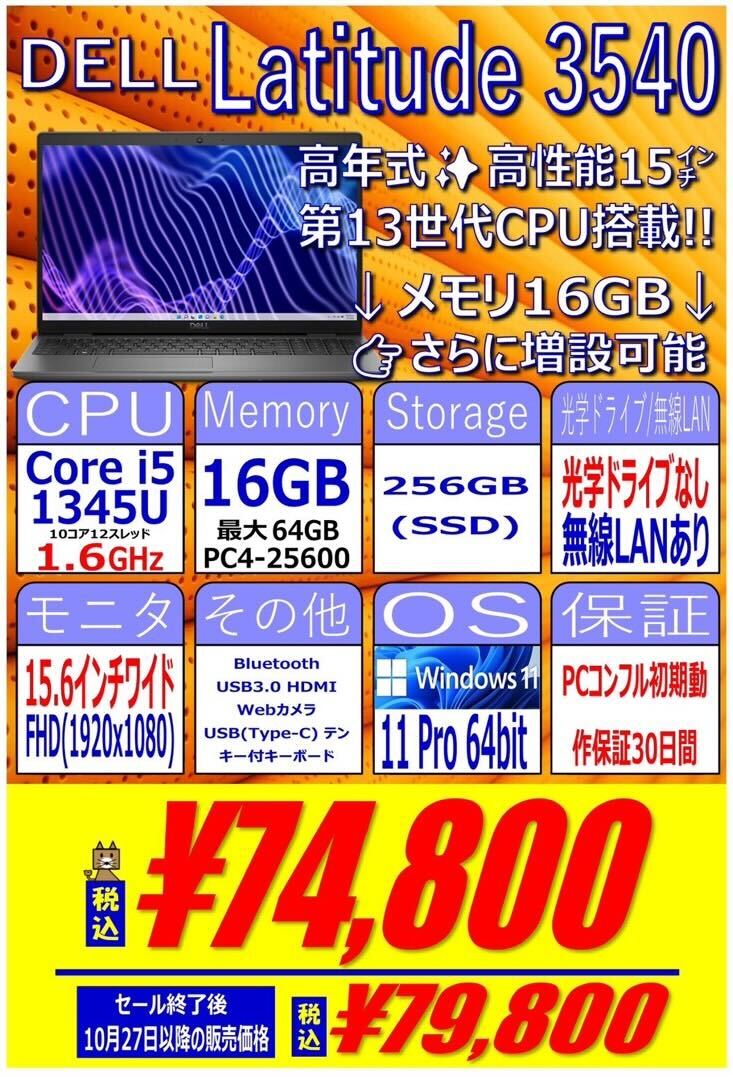 第13世代Core i5搭載、16GB / 256GB SSD、15.6インチワイドFHD、Windows11 Proという構成で74,800円です。