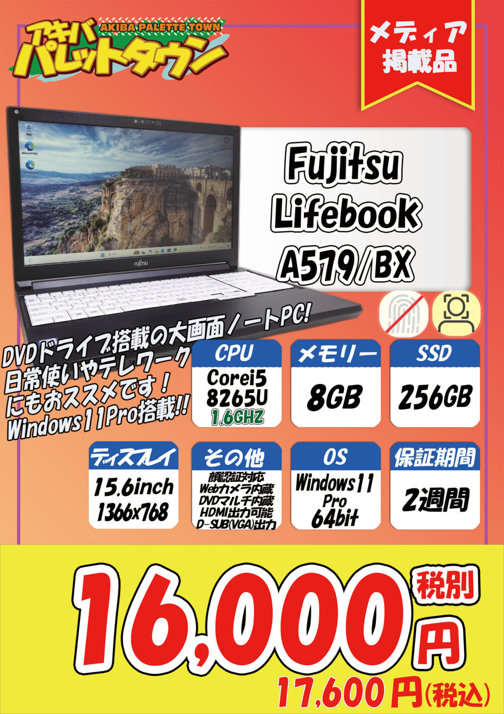 第8世代Core i5搭載、8/256GB SSD、15.6インチ、Windows 11 Proという構成で、17,600円です。