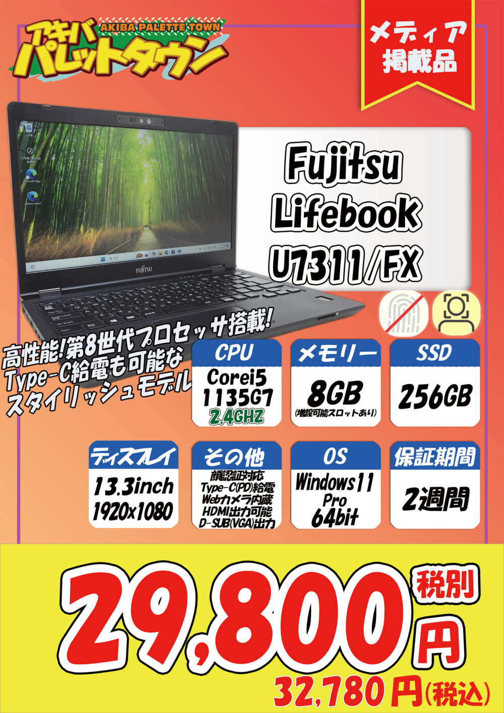 第11世代Core i5搭載、8 / 256GB SSD、13.3インチ、Windows 11 Pro搭載という構成で、32,780円です。