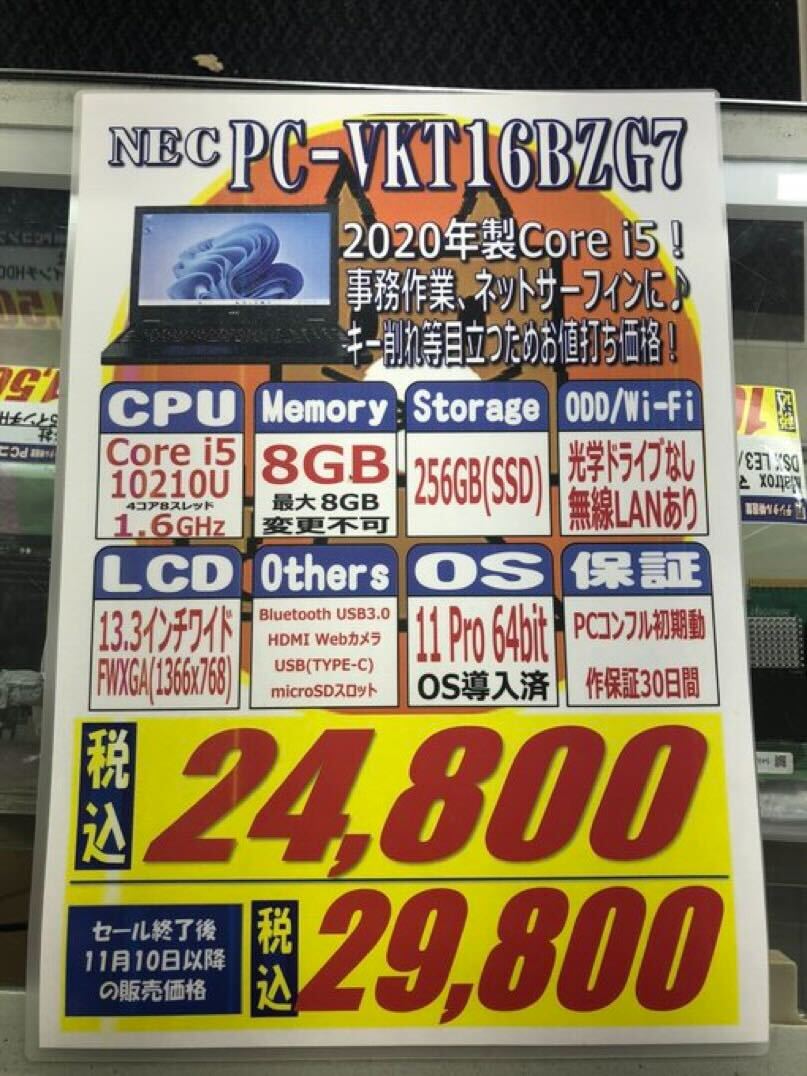 第8世代Core i5搭載、8GB /128GB SSD、12.5インチワイドFWXGA、Windows 11 proという構成のNEC製ノートPCが14,800円など、今週もお買い得品多数。