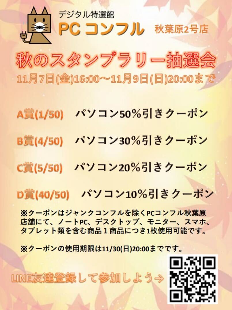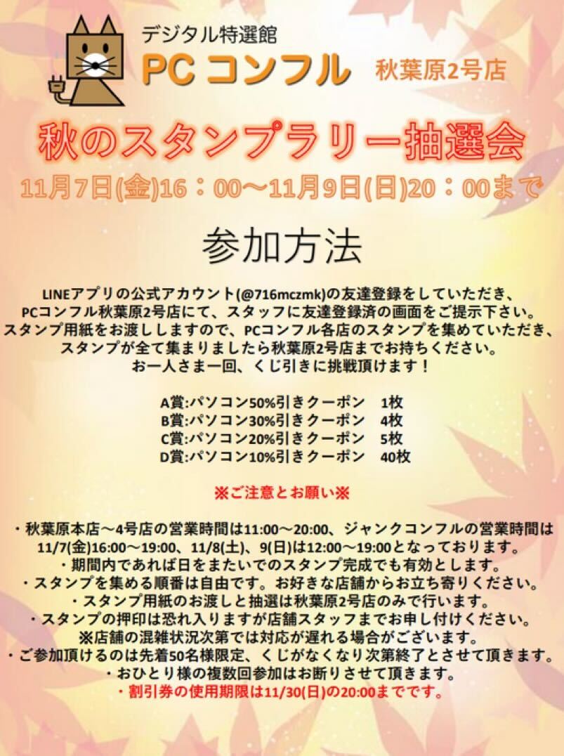 このうち、秋葉原2号店は、灼熱のスタンプラリー抽選会を、11月7日(金)16:00 – 9日(日)20:00まで開催します。