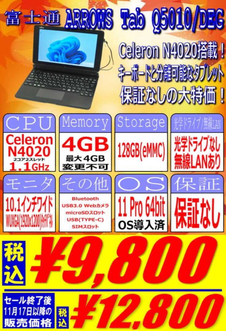Celeron N4020搭載、 4GB / 128GB eMMC、10.1インチワイドWUXGAタッチパネル対応、Windows11 proという構成で9,800円です。