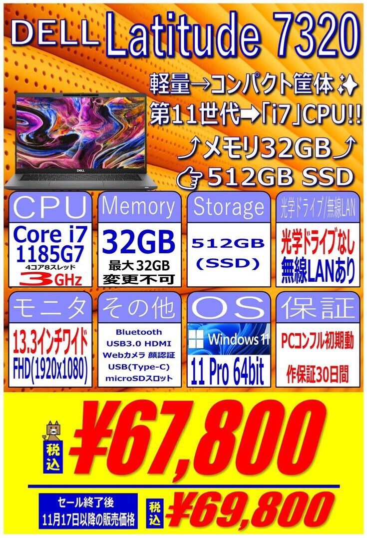 第11世代 Corei7搭載、32GB / 512GB SSD、13.3インチワイドFHD、Windows 11 proという構成で67,800円です。