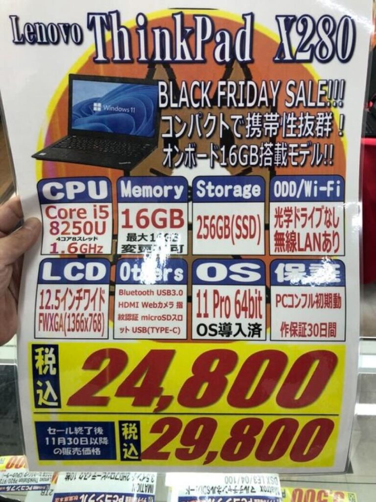 第8世代Core i5搭載、16GB / 256GB SSD、12.5インチワイドFWXGA、Windows 11 proという構成で24,800円です。